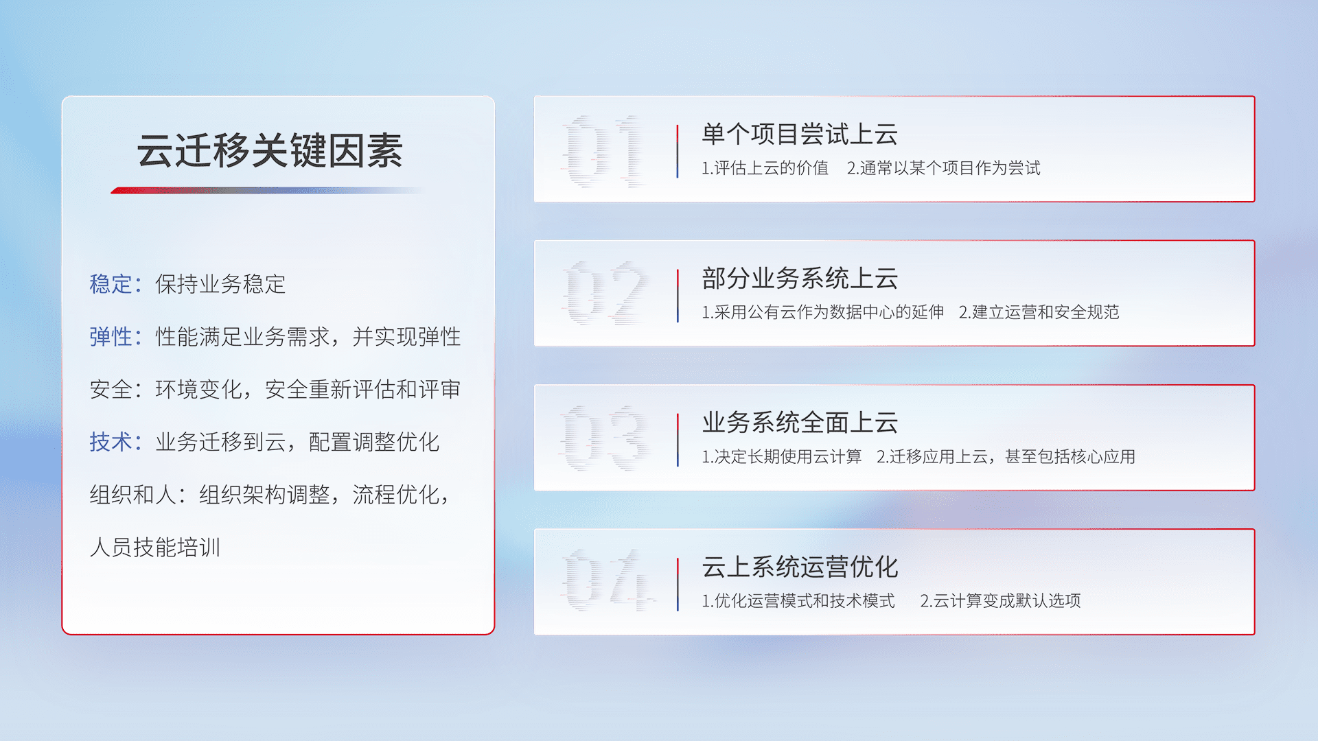 结合实际业务,,,,从规划设计、、、云平台选型、、云原生改造、、数据迁移、、、、集成交付,,,迁移全过程为客户识别最佳上云路径,,,做好风险识别管理,,,,设计网络架构、、、、身份权限、、安全审计合规、、、、操作审计、、、日志审计、、监控告警策略、、多站点容灾设计等,,,,对云上基础设施进行整体规划,,,提升IT治理水平,,以满足弹性、、高可用、、、高性能的需求。。。。