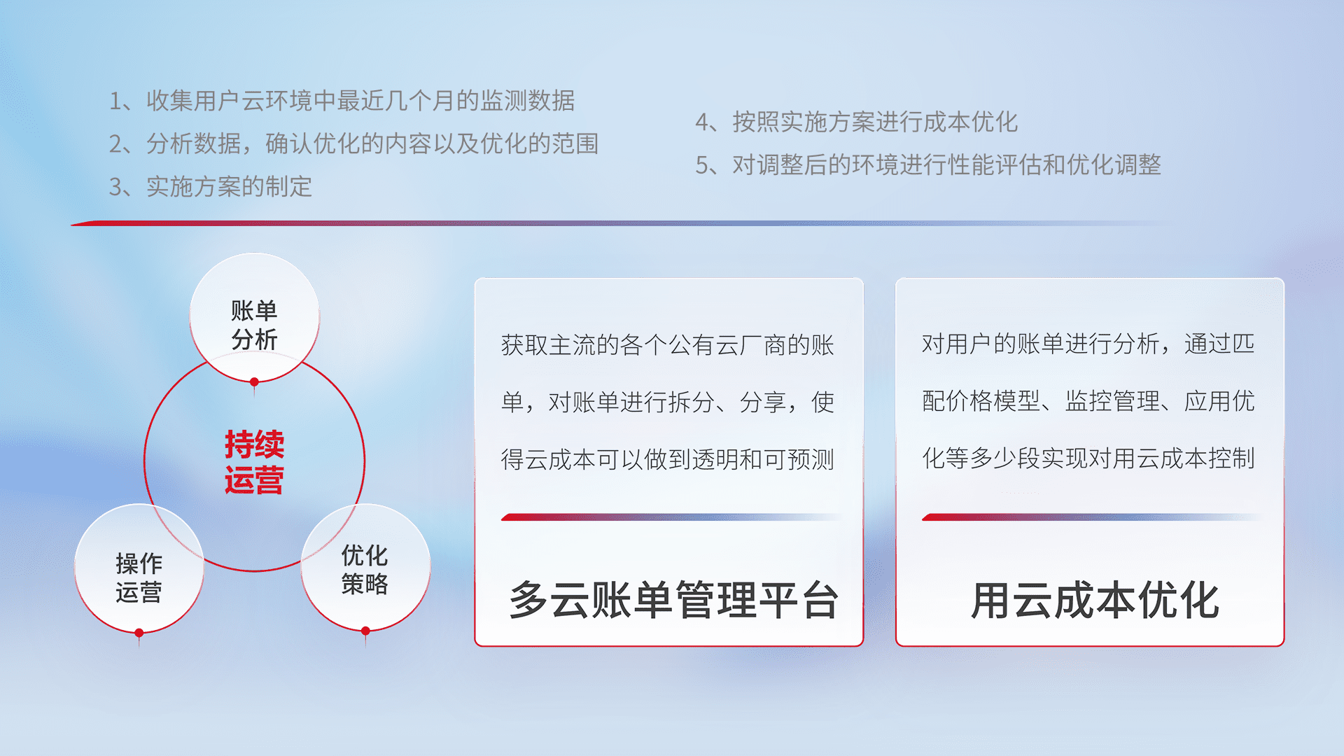 通过多云纳管,,,以统一的资源数据模型把客户的云资源进行抽象和封装,,进而实现对多云资源的统一操作,,,保障云资源管理的可靠性、、、、稳定性与可用性。。量身定制化运维内容,,,配置、、开发运维、、、、补丁管理、、备份、、、监控、、、认证和访问管理、、、、审计和日常巡检等,,,,保障在用云过程中的可靠度,,稳定度以及高可用率。。
